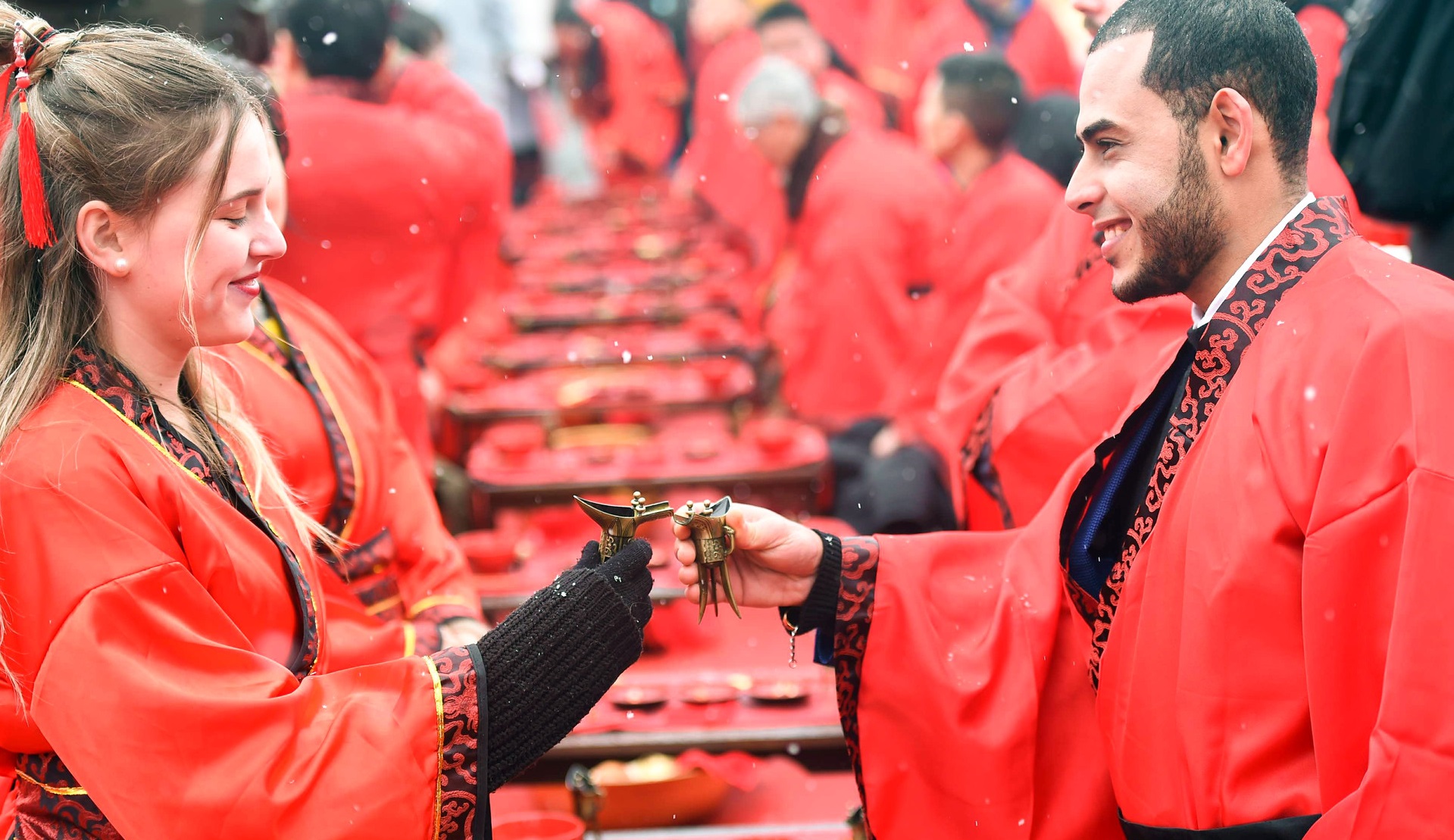 在零下3℃的极寒雪地间,举行汉式集体婚礼,恐怕终生难忘吧!就在2019第10届武隆仙女山冰雪季开幕式当天,一场盛大的汉式雪地集体婚礼举行,来自全国30余个省市、港澳台地区和俄罗斯的99对新人身穿大红色的汉服,体验了一把中国传统婚礼,成为白雪世界里最亮丽的风景线,场面盛大而又庄严。