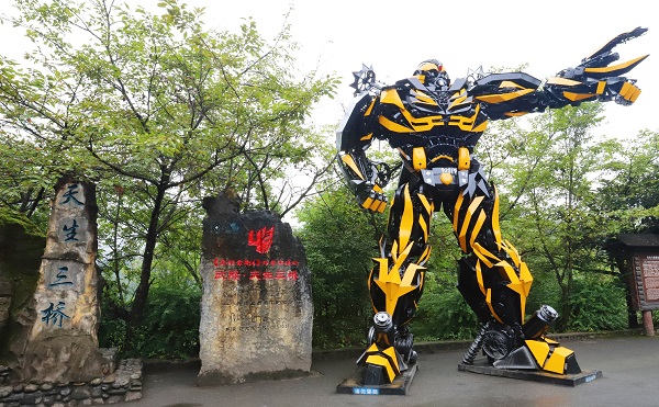 为了纪念《变形金刚4》,景区制作了两个巨型变形金刚模型,其中大黄蜂模型放置于景区入口处,机械恐龙模型放置于坑底,它们已成为广大游客及金刚迷的必打卡点。