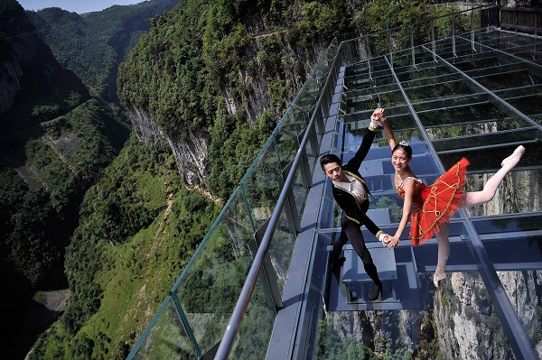 在天生三桥悬崖玻璃眺台上演“空中芭蕾”。