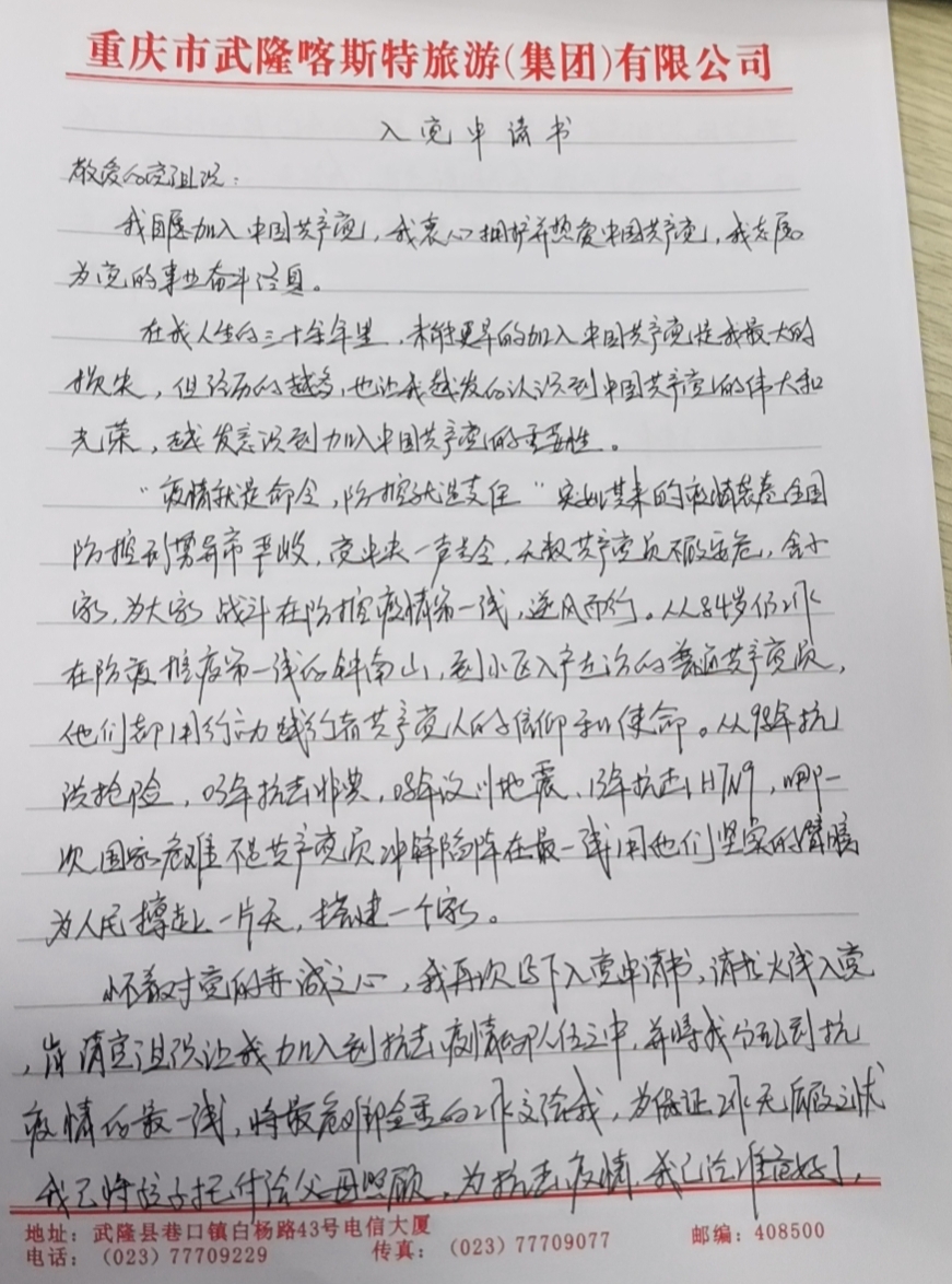 在抗疫过程中,党员们充分发挥党员先锋模范作用,纷纷主动请缨加入“战场”,成为逆行者中的一份子,彰显舍小家为大家的无私奉献精神。带着对党的敬意和向往,员工刘建梅更是在抗疫期间向党组织提交了火线入党申请书,申请以党员身份加入抗疫工作,并请求分配到最危险任务。