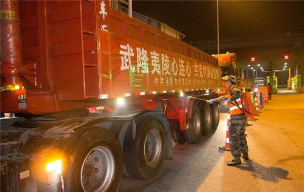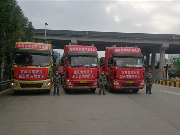2月13日,满载驰援湖北省宜昌市夷陵区生活物资的3辆大货车从武隆高速出发。