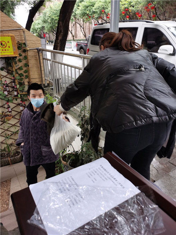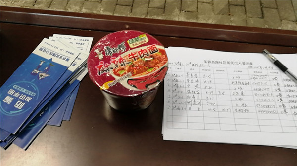 世纪广场的鑫栈超市工作人员,看到志愿者早中晚都是面包+泡面+牛奶,看在眼里,十分心疼,主动为志愿者提供开水、桌凳等支援管控服务。
