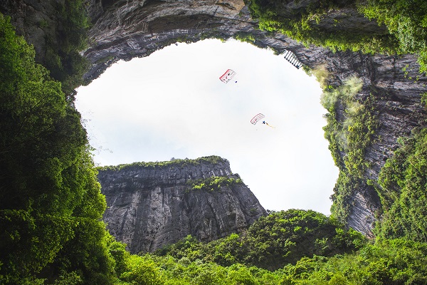 除了游客聚集打卡,因为险要的喀斯特地貌景观,这里常常成为各大户外极限挑战的热门选择之地。2019年5月1日,6位国际顶尖飞行高手聚集这里,上演了一场惊险又刺激的极限挑战,他们从玻璃眺台上一跃而下,完成世界首次低空跳伞穿越天生三桥。选手们在空中的瞬间更是与壮美磅礴的自然景观形成一幅视觉大片,令人感慨、惊叹!