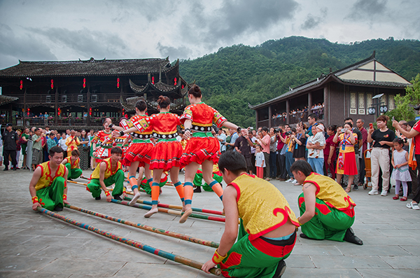游客参与性极强的竹竿舞。(摄影/王俊杰)