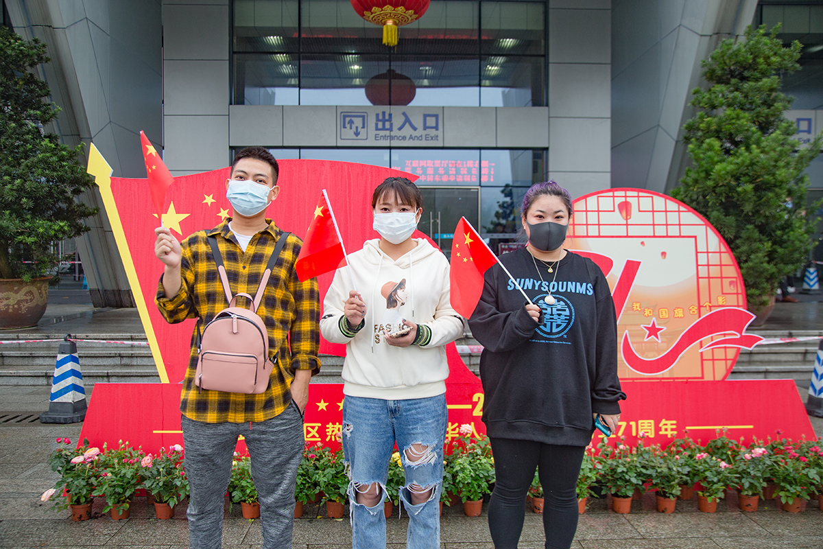 三名年轻游客向祖国表达生日祝福。