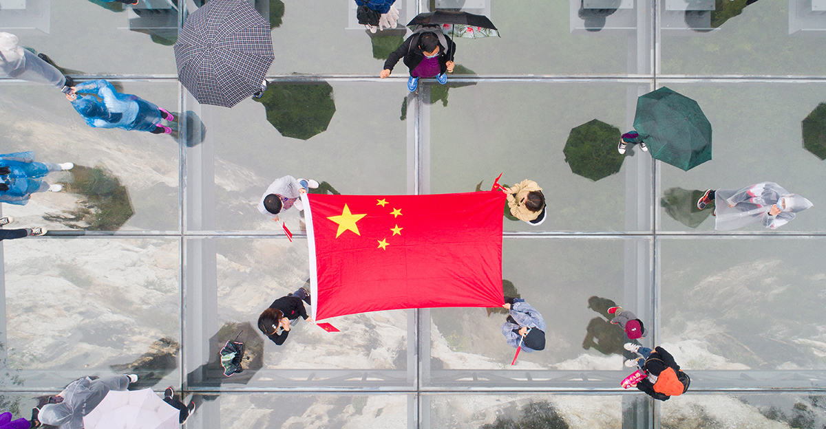 游客在300米悬崖绝壁上空拉国旗向祖国告白