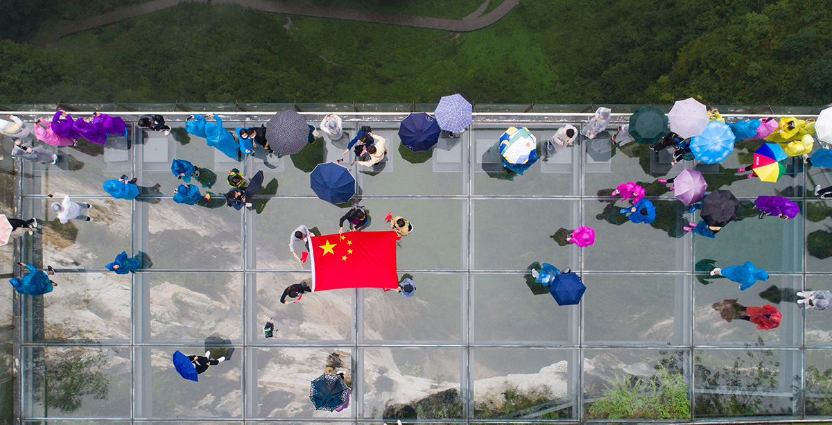 今天(10月1日)是中国人民共和国成立71周年纪念日,下午2点左右,多名游客登上武隆天坑(天生三桥)悬崖玻璃眺台,在300米高空拉国旗合影,向伟大祖国送上生日祝福!