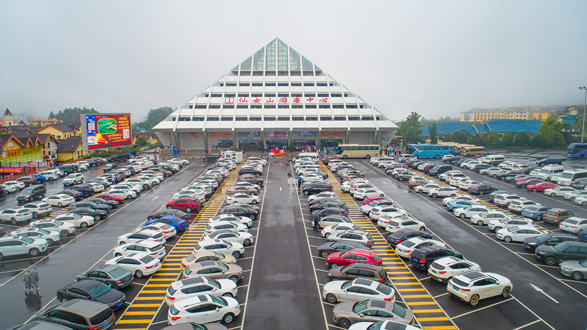 仙女山镇游客接待中心自驾车辆停放整齐。(图/王俊杰)