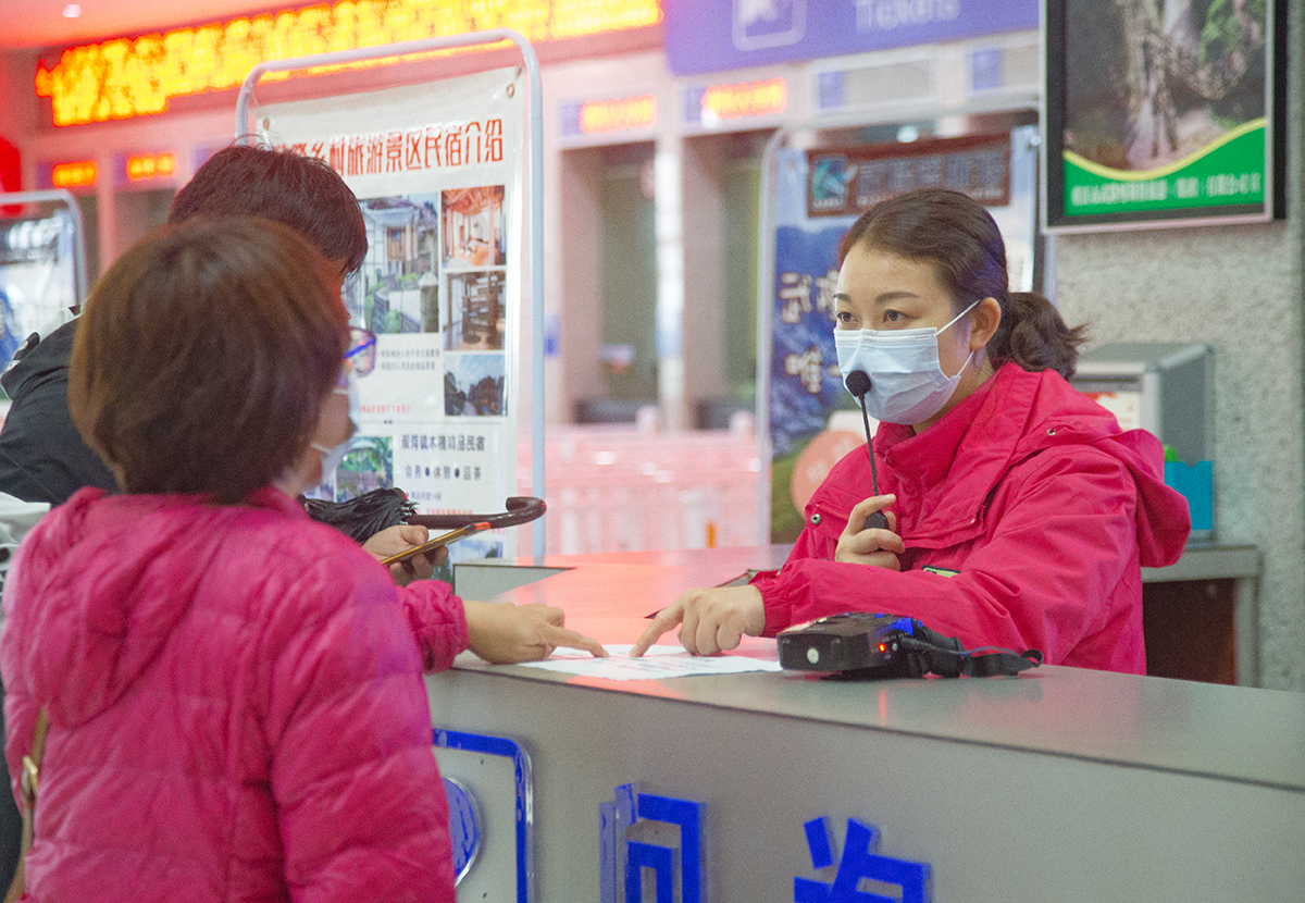 “您好,请出示您的身份证及健康码。”在仙女山镇游客接待中心,景区工作人员对每一位游客进行健康码查看、体温测量等,一系列检查后合格的游客方可购票进入,从源头上保障景区内每一位游客的安全。