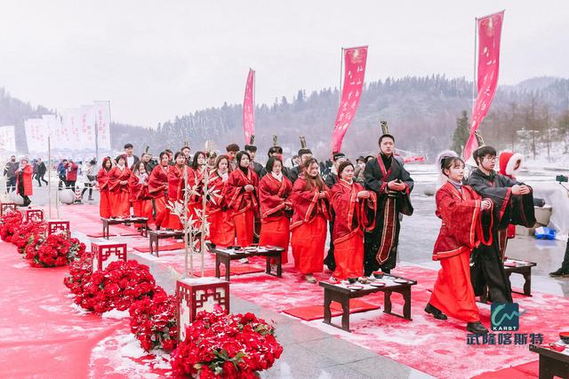 2020年,谐音“爱你爱你”,这么浪漫的年份怎么能少了雪地集体婚礼“扎场子”,雪地集体婚礼是每年仙女山冰雪季的重头戏。就在武隆仙女山冰雪季开幕式当天,一场盛大的汉式雪地集体婚礼举行。30对新人身着汉服、遵汉礼,步履优雅、庄重地走进雪地婚礼现场。在礼官的带领下,新人们行却扇礼、沃盥焚香、同席雅坐、同牢合卺、交换信物、执手偕老,在古老的仪式中向彼此许下爱情承诺。