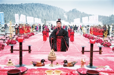 低空飞行鸟瞰仙女山“南国雪原”壮丽雪景,享受唯美视觉大餐;汉式雪地集体婚礼弘扬中华传统文化,30对情侣在雪地中浪漫“完婚”;