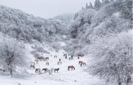 冬季出游仙女山,乘坐小火车观赏冰雪世界必不可少。坐着欧式小火车穿行于白色世界中,在高低起伏的最美公路,看着无边际的雪景向远方延绵,最后消失在尽头。道路两旁不时有悠闲的牛马出来寻觅吃的,共同形成一幅惬意画面。