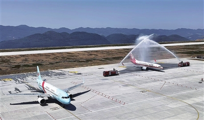 28日,在仙女山机场降落的航班均受到“过水门”礼遇。(王俊杰/摄)