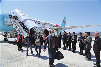 工作人员热情迎接旅客下机。(王俊杰/摄)