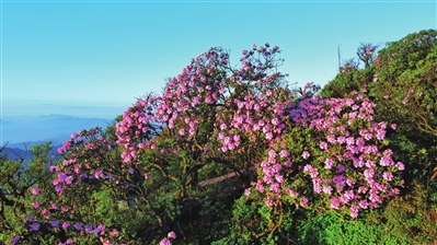 记者在现场看到,成片的杜鹃花竞相绽放,红色的、白色的、粉色的在枝头随风摇曳,五彩斑斓,艳丽盎然,山脊数公里变成了花的海洋。游客们穿梭其中,赏景拍照,感受浑然天成的自然之美。