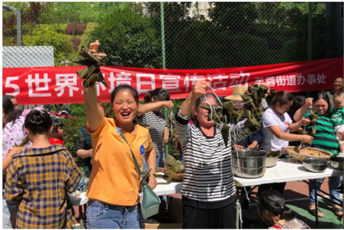 庆祝活动以“我们一起过端午”为主题,活动中,来自铁佛寺社区的居民朋友们10人一组,折粽叶、盛糯米、折角、绑绳,一眨眼的工夫,个个棱角分明、嫩绿清香的粽子就完成了,串串粽子高高挂,也象征着居民们的生活节节高。