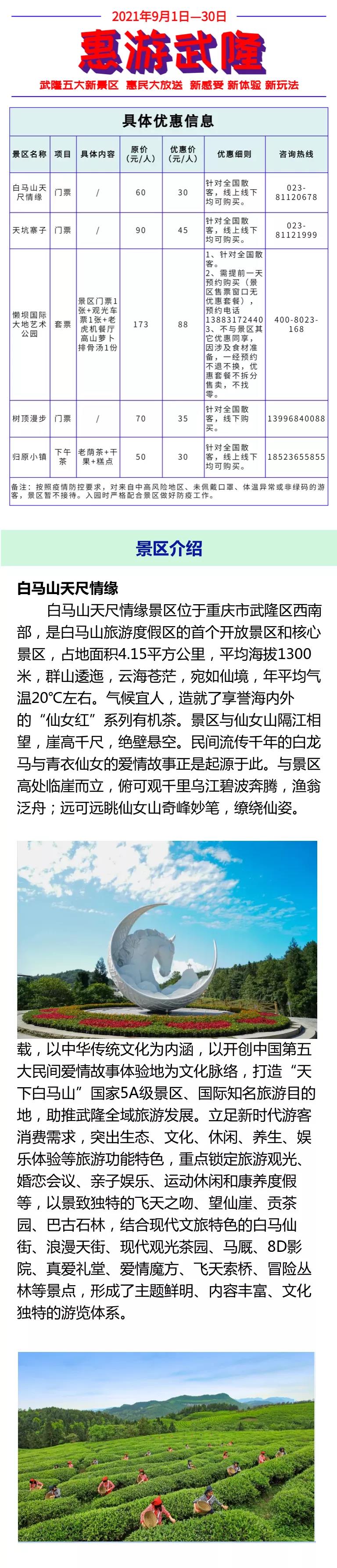 文章来源: 武隆文旅 作者:匿名 时间:2021-09-06 14:44:12摘要: 9月1日到9月30日,武隆白马山、天坑寨子、懒坝、树顶漫步、归原小镇五大新品景区惠民大放送,新感受,新体验,新玩法。【免责声明】:本平台发布及转载文章仅作同行交流学习,部分数据来源于网络,未经证实,并非商业用途,也并非针对具体单位和个人,请勿对号入座,部分内容及图片来源于网络,版权归原作者所有,若未能找到作者和原始出处还望谅解。如有版权疑问,或者文章内容出现侵权行为,请联系本官网后台,我们会第一时间及时进行删除处理,谢谢。