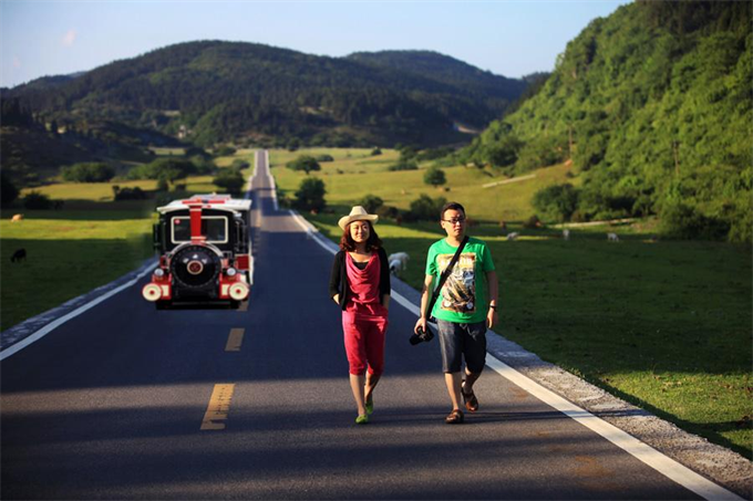 高颜值的最美公路是仙女山景区的网红景点。公路两旁则是成茵的绿草、悠闲的牛羊,三者构成了一幅惬意悠闲的画面。站在路边,尽管偶尔有观光小火车经过,但没有任何噪音,环境仍是如此优雅宁静。如果遇到细细秋雨,草原上还会升起袅绕的雾气,犹如仙境般,更是难得的美景。