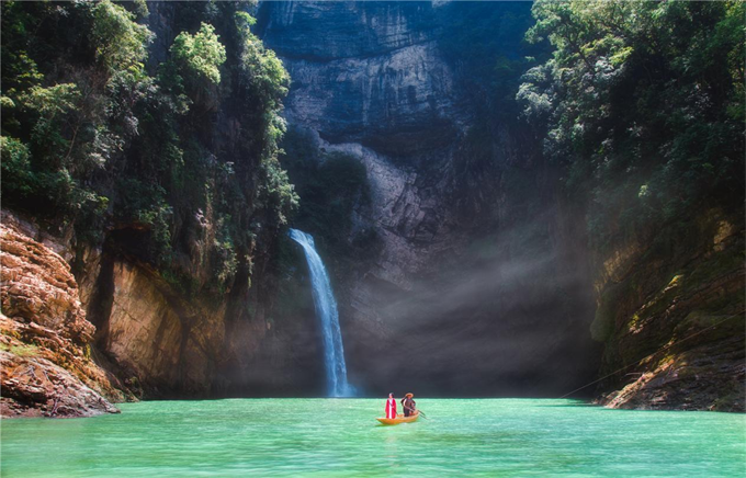 武隆美景中有海拔2000米的仙女山,也有海拔200米的芙蓉江。相比仙女山而言芙蓉江的秋色虽来得慢了些,但依旧让人陶醉。乘坐于芙蓉江游船上,不禁想起诗人王维的“清风拂绿柳,白水映红桃。舟行碧波上,人在画中游”。沿途三河口、芙蓉仙女峰、盘古苗寨、玉兔望月峰、龙孔飞瀑、黑叶猴保护区、蝴蝶谷等景点异常出彩。立足于船头,融山、水、泉、洞、峡于一体的芙蓉江美景映入眼帘,两岸青山、一江翠水、清新独特的江风迎面而来,给人“貌似漓江,胜似三峡”的绝美享受。