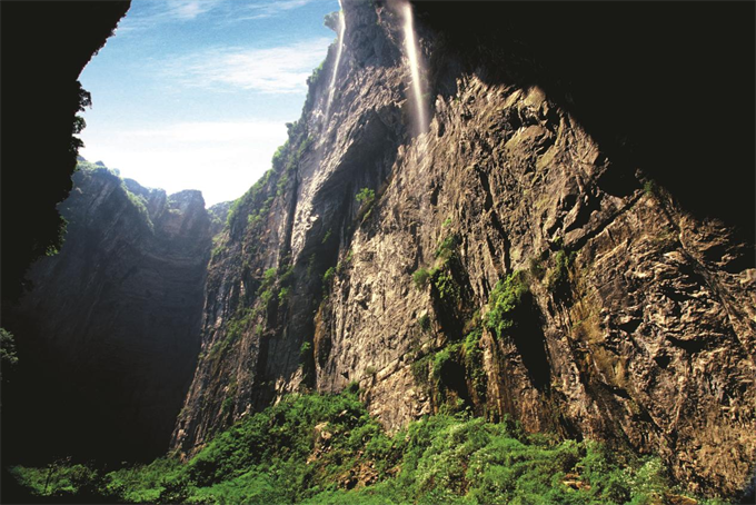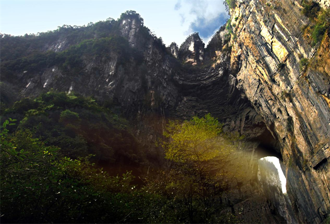 初秋的天生三桥绿意犹存,星星点的黄色、红色让原本宏伟壮观的天生三桥增添了些许的温柔。透过洞孔穿越空谷,你会觉得山连桥,桥连洞,洞连谷,像一群巨大的镂空立体石雕。从石雕顶部的空隙处,你会看到远处的山峦云彩从外边浓缩进来。天空已收成一个不规则的油饼,亦可看成是一个哲人的脸谱。空谷间的崖壁、绿树、清溪、驿站,扑入眼帘,令你应接不暇。