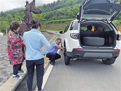 日前,武隆区公安局白马山治安派出所接到游客求助,称在景区游玩返回途中,由于不熟悉路况,在驾驶车辆倒车时操作不当,导致车辆撞击边坡后爆胎,需要民警帮助。