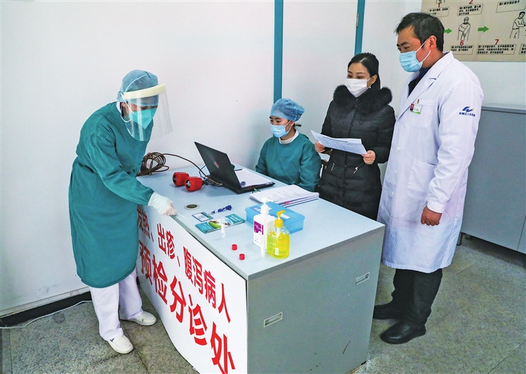 图为区人民医院纪委干部现场督查预检分诊处消杀及登记情况。(特约通讯员 黄锐/摄)