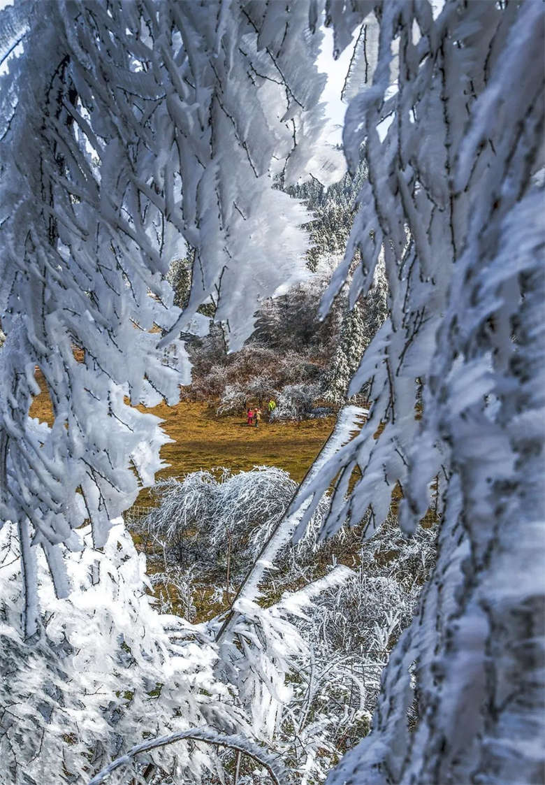 仙女山的雾淞,千姿百态、漫山遍野、晶莹剔透,特别像能工巧匠精雕细刻的水晶工艺品。