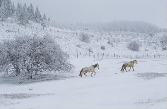 早上八点开始,如花瓣般的大雪便密密麻麻、窸窸窣窣从天空中飘落。如丝,如沙,如叶,如棉花的雪花,在林间轻盈飞舞,不一会儿就“染白”了枝头、草原。金黄的银杏、热情的红叶在白雪的映衬下,“燃烧”出最艳丽的色彩,如梦似幻宛若人间仙境。