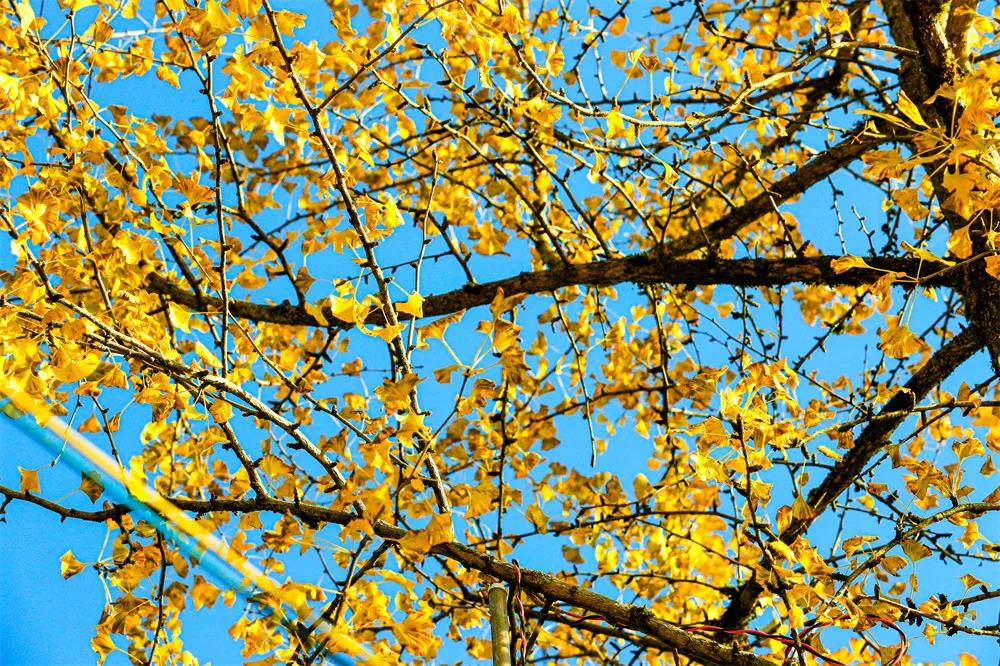 抬头,可见挂满树枝的金灿灿的银杏叶,