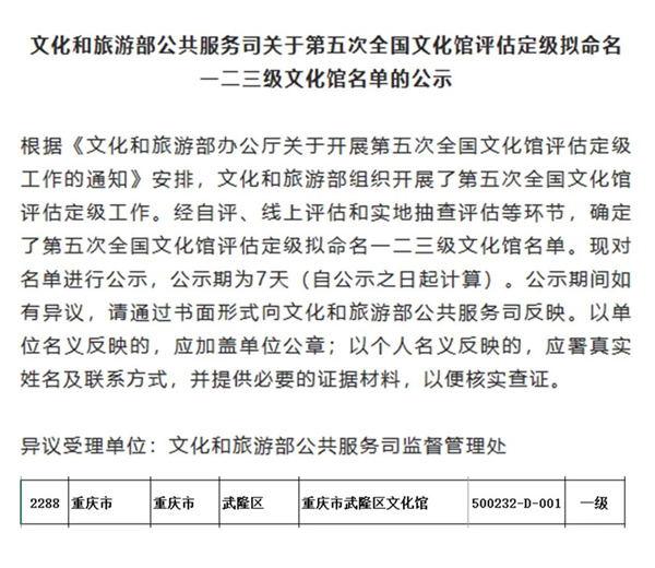 近日,国家文化和澳网官方网站部公共服务司公示的《第五次全国文化馆评估定级上等级文化馆名单》中,武隆区文化馆被评为国家一级馆。
