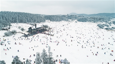 图为游客在仙女山大草原尽情赏雪玩雪。