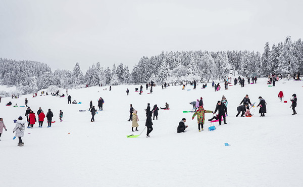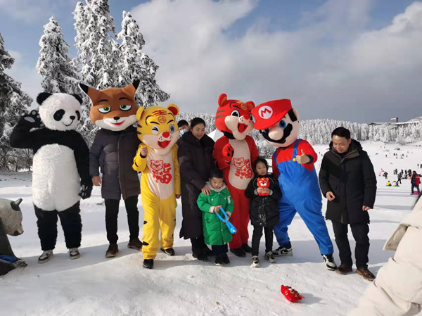 当日,NPC卡通玩偶与游客亲密互动,小老虎、光头强、财神爷、呆萌兔等角色玩偶,带领游客在仙女山大草原开启了一场别开生面的冰雪舞会,让游客真切感受冰雪奇缘的浓厚氛围。来自合川的陈女士一家表示,冰雪舞会活动极具新意、趣味十足,增添了不少互动乐趣。