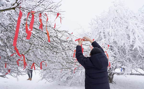 上午10点,小编在仙女山看到很多游客站在银花树下,闭紧双眼,虔诚地紧握双手,默默地许着新年愿望,让我不忍心上前,生怕惊扰了他们。愿望是我们每个人都有的,它蕴含着人生的祈求与精神寄托。站在银花树下许心愿,动手挂上心愿卡,你的愿望就有机会实现,不信你来试试看。
