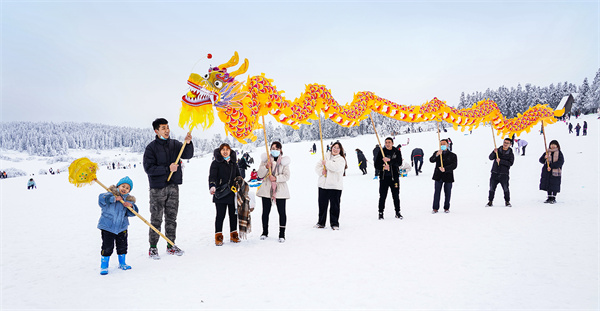 进入仙女山景区,这里张灯结彩,热闹非凡,处处呈现出浓厚的新春节日氛围,游客们在如梦似幻的冰雪童话世界里,尽情地打雪仗、堆雪人、滑雪、拍照,玩得不亦乐乎,直呼过瘾。同时“寻宝武隆迎新春”“舞龙表演”“冰雪世界的舞会”等系列新春活动纷呈,吸引了游客纷纷参与。
