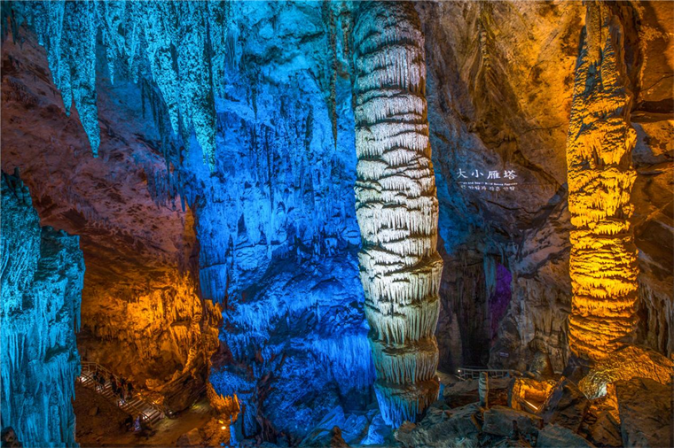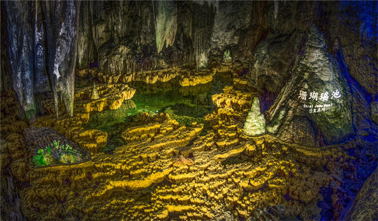 洞中金銮宝殿、雷峰宝塔、玉柱擎天、玉林琼花、犬牙晶花、千年之吻,动物王国、海底龙宫、巨幕飞瀑、石田珍珠、生命之源、珊瑚瑶池等景点形态迥异,光怪陆离,让人不禁感叹大千世界无奇不有,大自然造物之神奇。