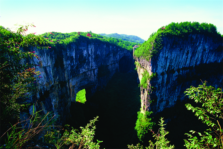 在武隆仙女山南部深藏着一处集雄、奇、秀、美于一身的天生三桥,三座桥的高度、宽度、跨度分别在150、200、300米以上,三桥呈纵向排列,平行横跨在羊水河峡谷上,将两岸山体连在一起,形成了"三桥夹两坑"的宏伟奇观。即便是从全世界范围来看,在距离几百米之内就有如此宏大的三座天生石拱桥和两个巨型的由塌陷形成的天坑也是世间罕见的。而且三桥的独步之处还在于三桥彼此之间林森木秀、悬崖万丈,修竹摇曳、飞泉流水,一派雄奇、苍劲、神秘、静幽的原始自然风貌,以山、水、瀑、峡、桥共同构成了一幅完美的自然山水画卷。