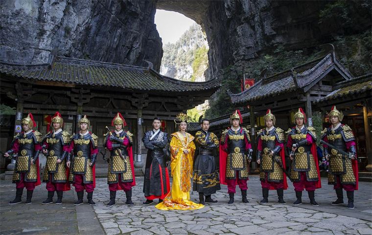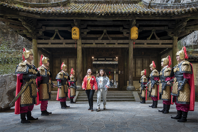 “女王驾到”“恭迎女王陛下”“诸位请起,游玩到此,观景甚美,诸位与我,共享此景。”在天生三桥景区天福官驿客栈,一群身形魁梧的带刀侍卫,整齐地站在驿站门口两侧恭迎每位入园的“女王”。现场仪式感爆棚,一身金黄的“女王”霸气外露。驿站内热闹的氛围吸引了众多游客参与,有的上前与侍卫互动拍照,有的主动穿上“女王”服体验霸气女王范,有的还主动表演起了电影里女王翻牌的有趣桥段。“今天我最大,这样过节着实过瘾”玩得正起劲的刘女士表示,这是她过得最好玩、最具仪式感的女王节。