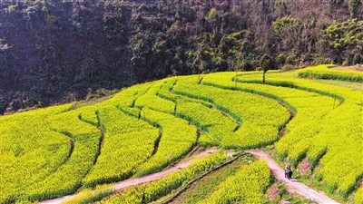 此时油菜花陆续盛开,花景或成片绽放,或错落田间,与乡村交相呼应,绘就成了一幅幅山乡春景图,吸引着大批游客前来踏春赏花,享受美好春光。