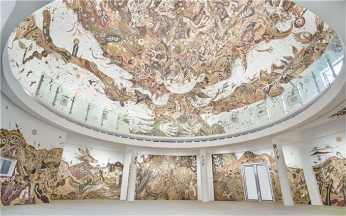 日本艺术家浅井裕介和他的团队耗时半年之久,采集武隆当地5种基础颜色的泥土,在完全没有使用任何工业颜料的情况下通过筛选、碾磨等工序调制成19种泥土颜料绘制的一幅恢弘巨作。他将在武隆的所见所闻,听到的神话故事,看到的一花一木,转化成了他的作品,他在穹顶上方的圆圈内画了四个神:风、火、水、土,让这四个神仙孕育了一片充满生命力的天上大地,这些天上的神仙洒落下来许多的种子,在降落的过程里,有的变成鹿,有的变成树、脚板、鱼等各种灵物,最终创造了一个世界。作品直击心灵,让人惊叹震撼。