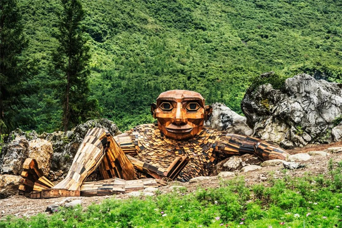 丹麦艺术家托马斯·丹博和他的团队利用废旧木材、竹子等制作了三个巨人,因为现代人们习惯看到一个什么用手机拍完就结束,而大自然有更多值得去探寻的地方,所以他把他的三个巨人分别藏在了园区,让大家在过程中寻找自然的美好。托马斯·丹博用自己父母的名字给巨人命名,而且还给这个作品命名为《爱的小径》。懒坝的巨人是他在中国的第一次巨人创作,也是他在全世界的第51、52、53个巨人。同时,作品也呼吁我们,保护生态,爱护环境,与大自然和谐共生。
