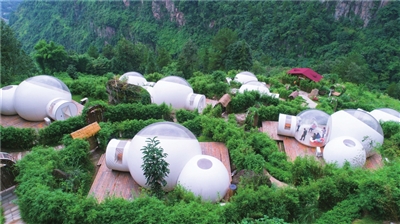 以“丛林探险”为主题元素,被人们誉为乌江北岸的“绿色肺叶”,有着优美的自然景观,在这里,可以参与户外运动,可以玩飞跃丛林,玻璃旱滑、飞拉达、铁索桥等等,户外运动项目还有教练指导,自然环境中体验不一样的“速度与激情”。玩累了,还可以住特色泡泡屋民宿。
