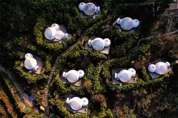 万峰呐溪原乡以“丛林探险”为主题元素,被人们誉为乌江北岸的“绿色肺叶”。在这里,有各类户外运动项目,比如飞跃丛林、玻璃旱滑、飞拉达、铁索桥等,这些项目均有专业教练指导,新手也能玩得不亦乐乎。此外,在大自然环境中体验不一样的“速度与激情”后,晚上还可以住特色泡泡屋民宿。