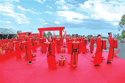 新人们身着锦绣霓裳在“礼官”的带领下,步履优雅而端庄地进入典礼现场,成为自然风景中一道最靓丽的风景线,场面盛大而又庄严。婚礼庆典活动完全仿照汉式集体流程进行,有暖堂颂词、击鼓鸣钟、拜四方、祈福燃香、沃盥之礼、同牢礼、合卺礼、解缨结发之礼等仪式,庄重典雅。