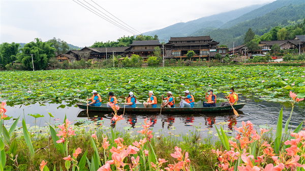“接天莲叶无穷碧,映日荷花别样红”,在荷花湖畔,放眼望去,200余亩的荷花开得正艳,在万绿丛中绽露笑颜,呈现出一种自然天成、出淤泥而不染的冰清玉洁。一阵微风吹过,感受微风拂过脸颊,空气中充满荷花的香味,让人心旷神怡。“Very beautiful!!!”外国友人连声称赞,一下车,便分成4个小组开始了荷花湖划船比赛的比拼。