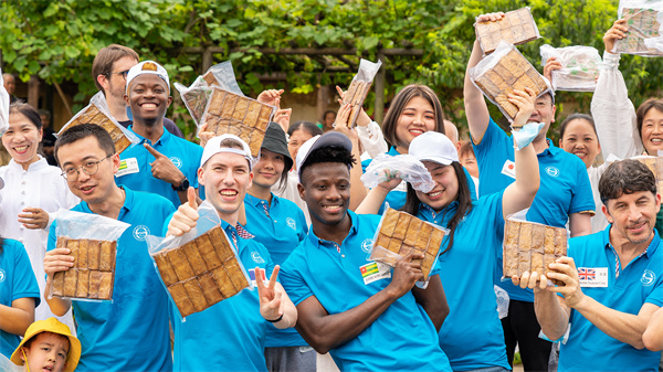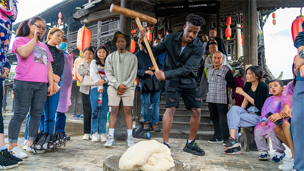 外国友人认真听着讲解员讲解古法豆干的制作流程,并走进豆干作坊,饶有兴致的参与推石磨、滤豆浆和卤豆干等环节。“真香!”吃着才烤制出的豆干,外国友人品味着自己的劳动成果。