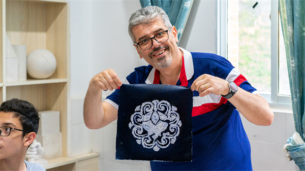 在聆听老师的讲解后,外国友人在染布上画出自己喜欢的图案,还特别署上自己的中文名字。在老师的指导下,通过上蜡,再染上天然植物提取的蓝靛,精美的图案就呈现出来了,老外们看着自己辛勤换来的成果,感到成就满满,对这种“蓝底白画”的风格赞不绝口。
