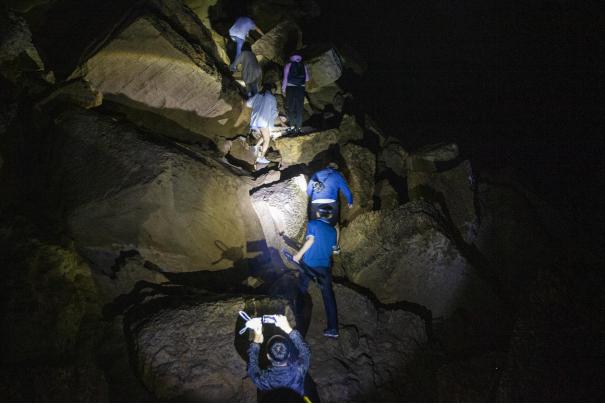 道路陡峭且湿滑,要半蹲身体,稳定重心方可安全通行。大家手挽着手摸黑向上爬行,在陡峭之处相互搀扶,小心翼翼地在石峰崖壁之间迂回盘旋。