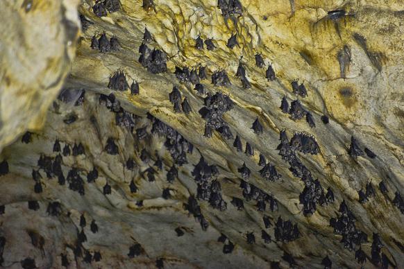 好巧不巧,才行了不过十分钟,许是被光亮和我们的声音打扰,突然头顶一片黑压压的蝙蝠群一阵骚动,便向四周到处乱窜飞扑。“大家快把火把熄掉!”应大哥经验丰富,急忙叫我们噤声趴在地面或岩壁上,煽动翅膀所发出的高频声音,让我终生难忘。