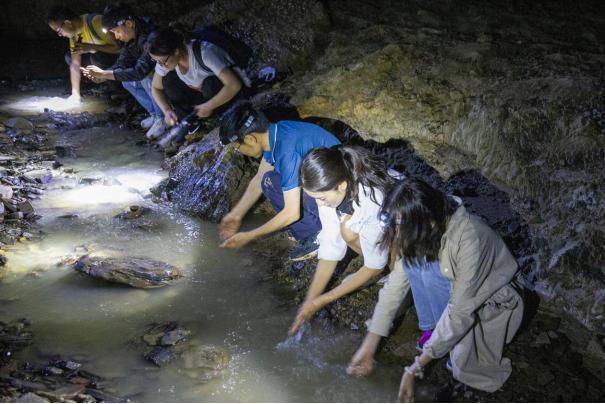 等待蝙蝠群飞走,应大哥急忙告诉我们快速离开。依靠手中的电筒,我们摒住呼吸匍匐着快速通过。翻过高耸的石山,洞内豁然开朗,依稀听见了水流声。“终于听见水声了,说明我们没有走错!”经过刚刚蝙蝠群的惊吓,应大哥一句话让我们悬着的心暂时着了地。