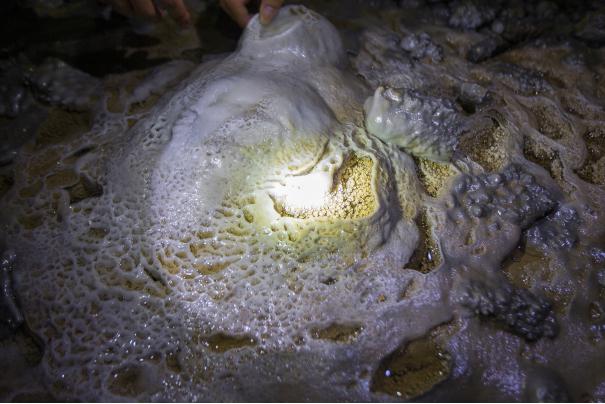 我们对地底下的认知远比地表少很多,因此想象空间巨大。岸边的乳石发育独特,同行的应大哥是个诗意的人,几乎为每个石钟乳都安排名字。惟妙惟肖地起着“明月逢莱”“仙人议事”“凤凰传奇”“奇珍异宝”“沙场点兵”名字。